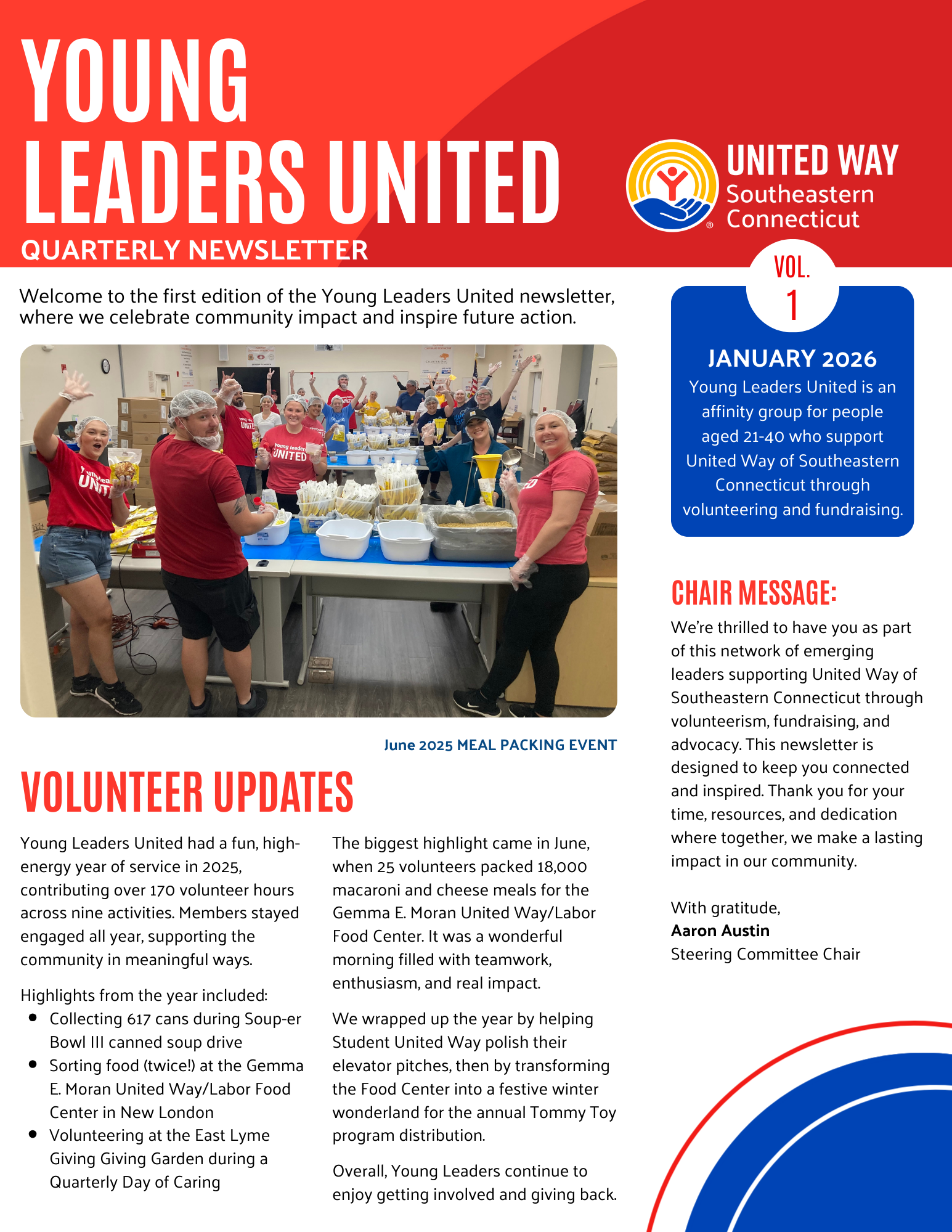 Why Join? Joining Young Leaders United is a great opportunity to meet other like-minded people who want to support New London County through United Way. The group offers social opportunities as well as the experience of fundraising and volunteering for a community cause. Young Leaders focus on United Way’s community impact work to gain a deeper understanding of the health and human services needs and opportunities in New London County.